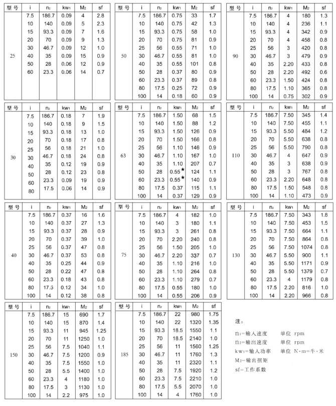 單級減速機(jī)規(guī)格有:25、30、40、50、63、75、90、110、130、150、185。
