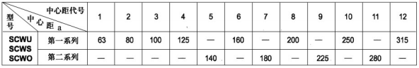 SCW系列軸裝式圓弧圓柱蝸桿減速機(jī)公稱傳動(dòng)比及傳動(dòng)代號(hào)見(jiàn)下表
